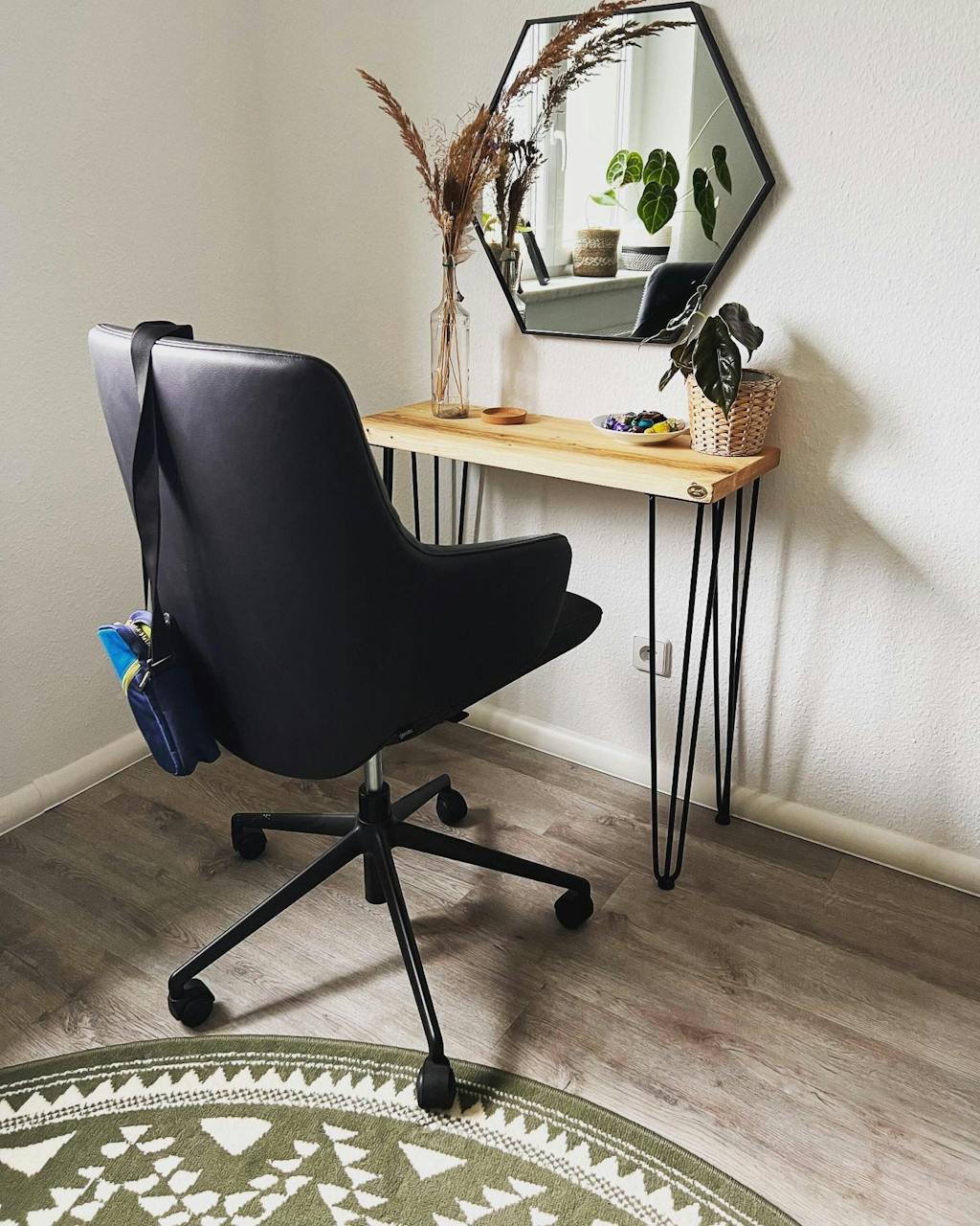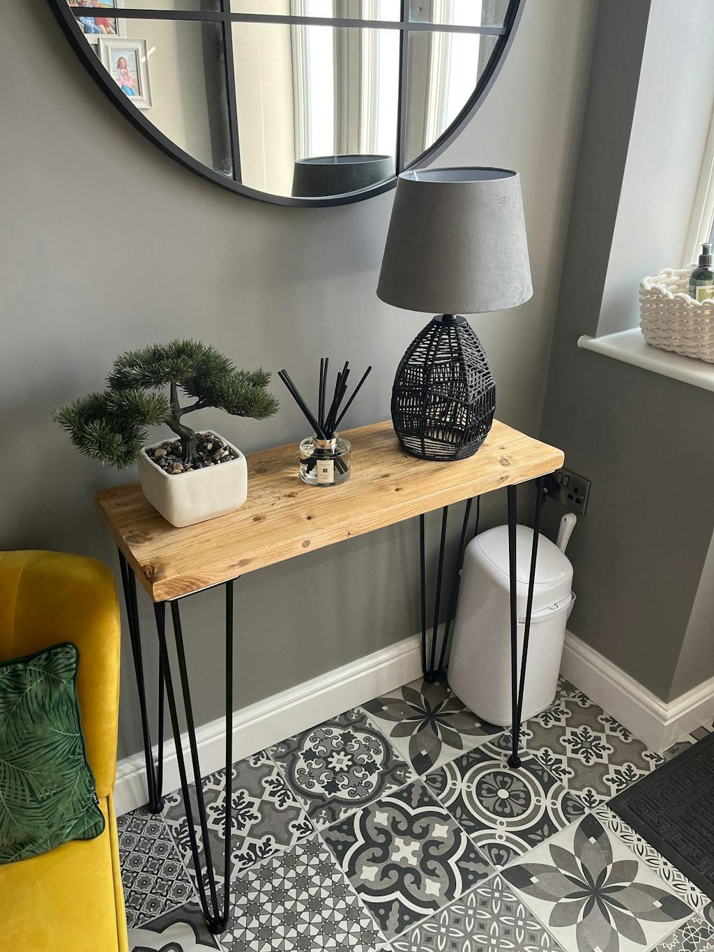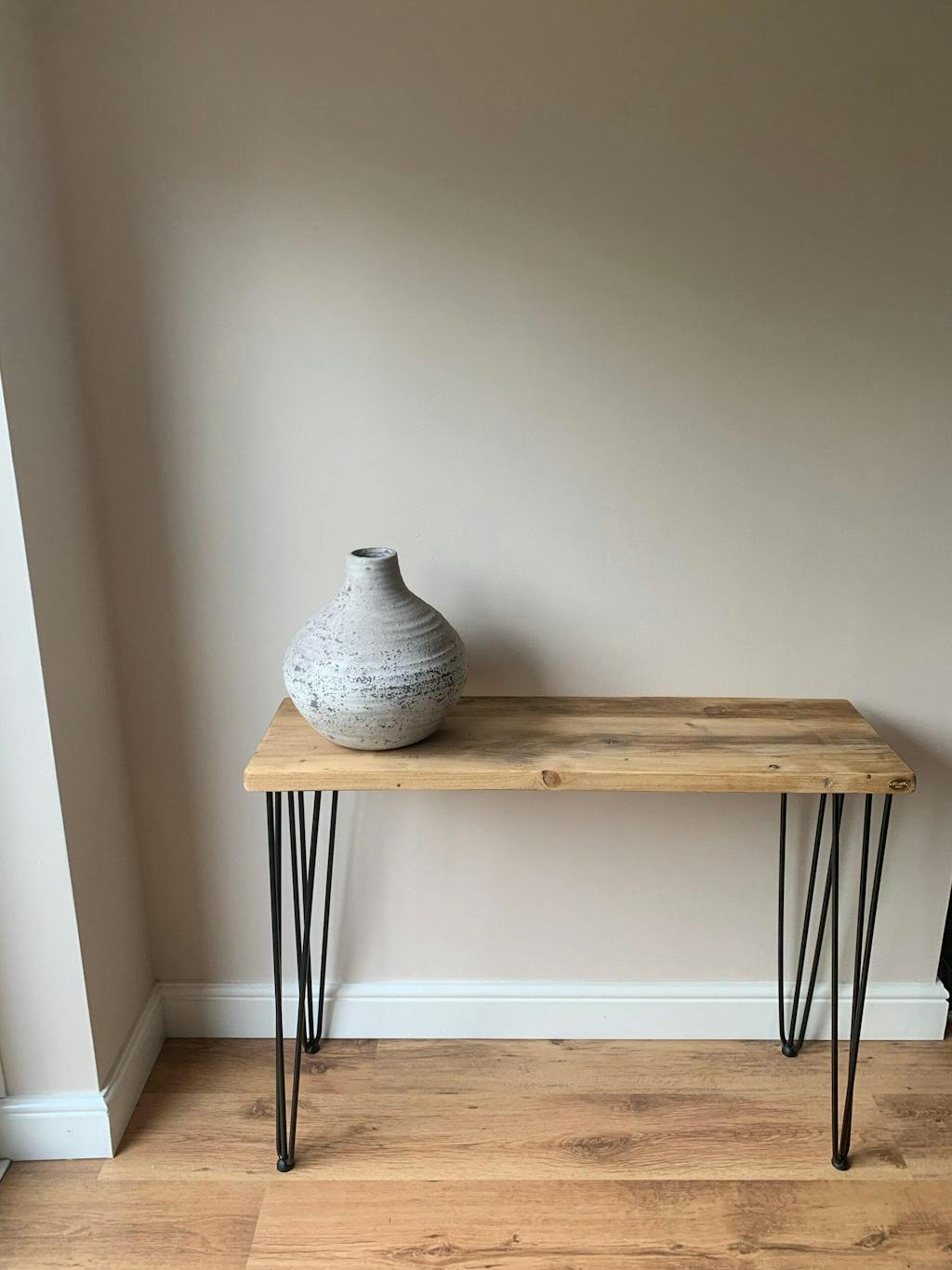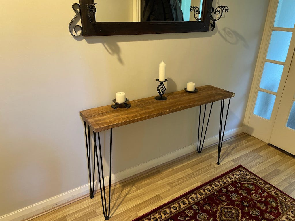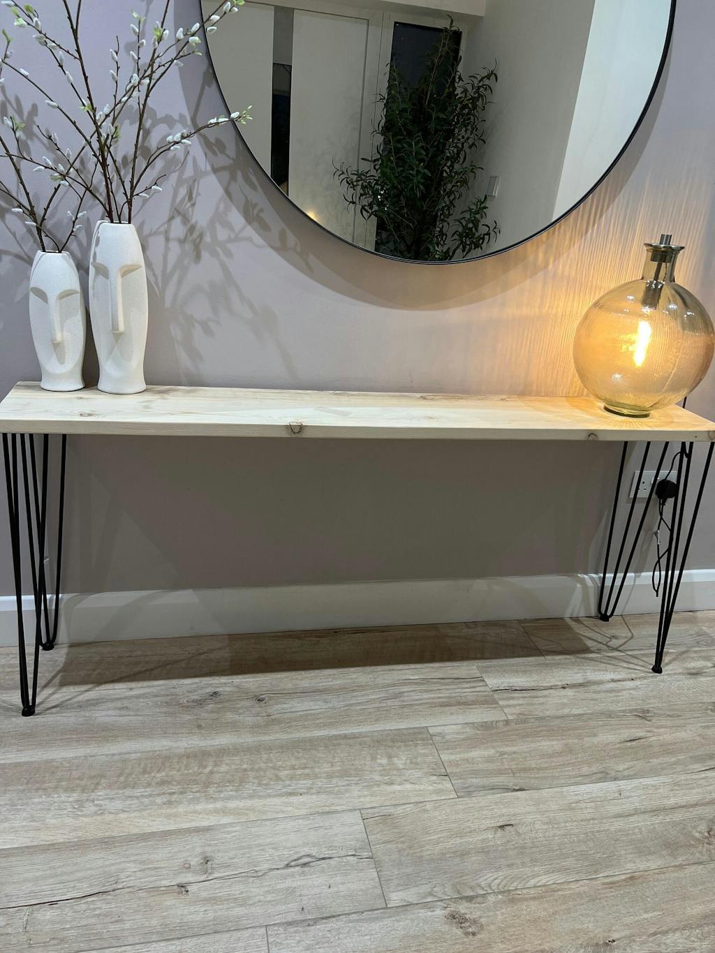 BIRGIT : console/table d'appoint fabriquée à partir de planches d'échafaudage récupérées triées sur le volet avec des pieds en épingle à cheveux en acier massif.